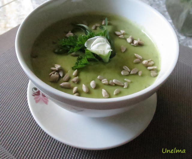 Kiehuvaan veteen lisätään kuoritut ja pilkotut kasvikset. Purjon vihreät lehdenosat olivat vielä virheettömät laitoin nekin keittoon. Nestettä kannattaa ensin lisätä vain sen verran, että kasvikset peittyvät. Kypsyneet kasvikset soseutetaan ja nesteen määrä tarkistetaan, vedenkeittimestä kaadetaan kuumaa vettä tarvittaessa. Lisätään liemikuutio, juusto murennettuna ja lopuksi kerma. Muuta suurustetta ei tarvita. Persilja, rakuuna ja auringonkukan siemenet lisätään vasta keiton pinnalle.